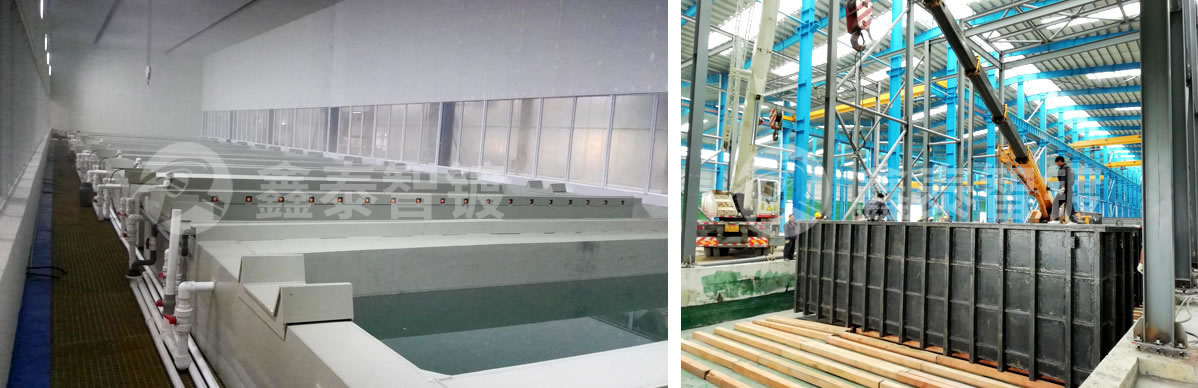 獨立鋼結構槽體做玻璃鋼防腐,底部外圍做防滲防腐處理。各工位酸洗槽獨立排布。 |