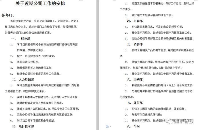 Готовность к возобновлению работы средств борьбы с эпидемией: все отделы подсчитывают запасы медицинских масок, защитной одежды (в основном для дезинфекции окружающей среды), 75% алкоголя (обезжиривания), 84 дезинфицирующих средства, дезинфицирующих средств для мытья рук, резиновых перчаток, мыла, термометров, инфракрасных термометров, распылителей, аварийных транспортных средств, экстренных лекарств и других средств профилактики эпидемии, гражданской обороны, технической защиты. Разработан ряд документов, таких как « Ежедневный регистрационный бланк дезинфекции для возобновления работы компании», « Форма получения защитных средств » и « Обязательство по основной ответственности за профилактику и борьбу с эпидемиями».